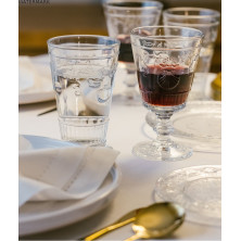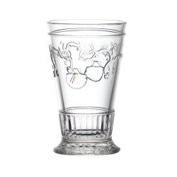 Szklanka z bogato zdobionej kolekcji Versailles francuskiej marki La Rochère, wykonana z prasowanego szkła, ozdobiona reliefowymi motywami barokowymi kwiatów, pnącej się roślinności i przegrzebków. Idealnie nadaje się do serwowania zimnych i ciepłych napojów.