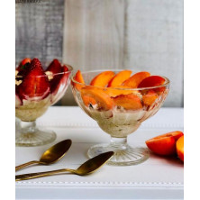 Stylowy pucharek z kolekcji Elise francuskiej marki La Rochère, charakteryzujący się wwypukłymi wzorami w kształcie migdałów. Wykonany z grubego prasowanego szkła, dzięki czemu idealnie nadaje się do codziennego użytku. Znakomity do serwowania lodów, owoców oraz zimnych i ciepłych deserów.