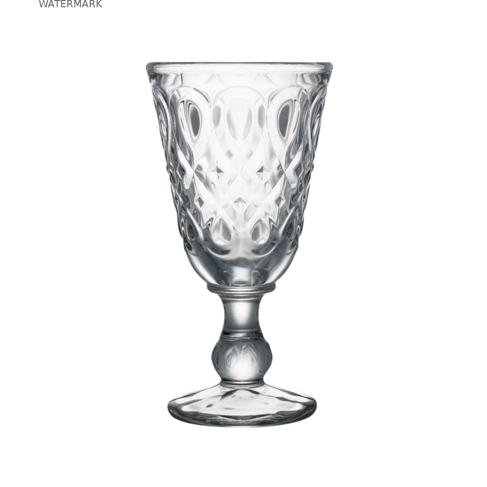 Kieliszek z wykwintnej kolekcji Lyonnais francuskiej marki La Rochère, wykonany z prasowanego szkła i ozdobiony wypukłymi, przeplatanymi wzorami inspirowanymi renesansem. Doskonale leżący w dłoni, jest przyjemnie ciężki. Idealnie sprawdzi się do serwowania zarówno wina czerwonego, jak i białego, a także wody, soków oraz zimnych i ciepłych napojów.