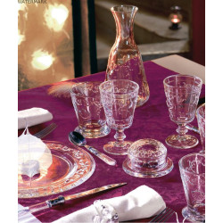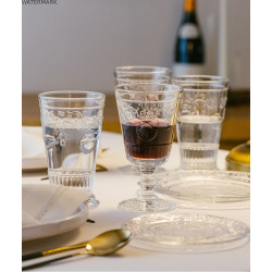 Kieliszek z bogato zdobionej kolekcji Versailles francuskiej marki La Rochère, wykonany z prasowanego szkła i ozdobiony reliefowymi motywami barokowych kwiatów, pnącej się roślinności i przegrzebków. Doskonale sprawdzi się do serwowania zarówno wina czerwonego, białego i różowego, wody, oraz zimnych i ciepłych napojów.